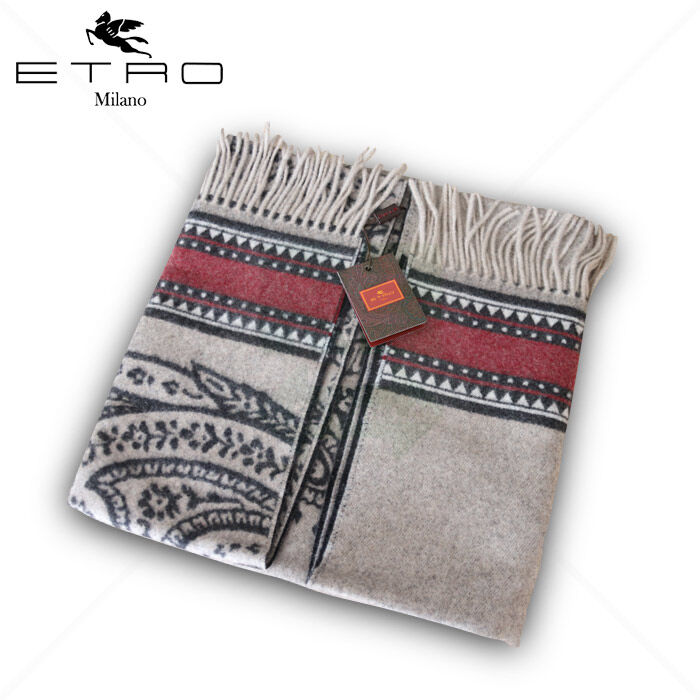 *NEU* Überaus gemütlicher und hochwertiger Designer Schal aus dem italienischen Hause ETRO. Der dezente Schal ist mit einem schönen Paisley Muster und ETRO Web-Logo versehen. Zusätzlich befinden sich an den Enden Fransen, die das klassische Design abrunden. Den Schal ziert auf der hellen Seite ein großflächiges Paisleymuster, während die andere Seite ohne das Paiseleymuster gestaltet wurde. Der Designer Schal besteht aus 100% Kaschmir, und ist somit wunderbar weich, überaus leicht und wärmt hervorragend. Der Schal hat eine Länge von 140 cm und einer Breite von 70 cm.